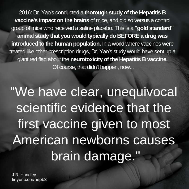 Dr. Yao’s second paper, conducted a thorough study of the Hepatitis B vaccine’s impact on the brains of mice, and did so versus a control group of mice who received a saline placebo. This is a “gold standard” animal study that you would typically do BEFORE a drug was introduced to the human population. In a world where vaccines were treated like other prescription drugs, Dr. Yao’s study would have sent up a giant red flag about the neurotoxicity of the Hepatitis B vaccine. Of course, that didn’t happen, and this is the first time you’ve probably ever heard of this study: