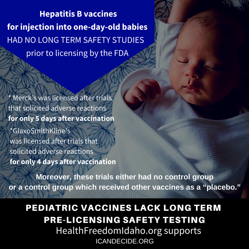 For example, there are two Hepatitis B vaccines licensed for one day old babies in the United States – one manufactured by Merck and the other by GlaxoSmithKline. Merck’s Hepatitis B vaccine was licensed by the FDA after trials which solicited adverse reactions for only five days after vaccination.17
