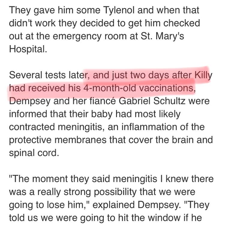 “…just two days after Killy had received his 4-month-old vaccinations, Dempsey and her fiancé Gabriel Schultz were informed that their baby had most likely contracted meningitis, an inflammation of the protective membranes that cover the brain and spinal cord.”