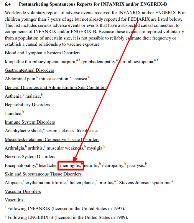 “Worldwide voluntary reports of adverse events received for INFANRIX and/or ENGERIX-B in children younger than 7 years of age, but not already reported for PEDIARIX, are listed below. This list includes serious adverse events or events that have a suspected causal connection to components of INFANRIX and/or ENGERIX-B. Nervous System Disorders: Encephalopathy, headache, MENINGITIS, neuritis, neuropathy, paralysis.”