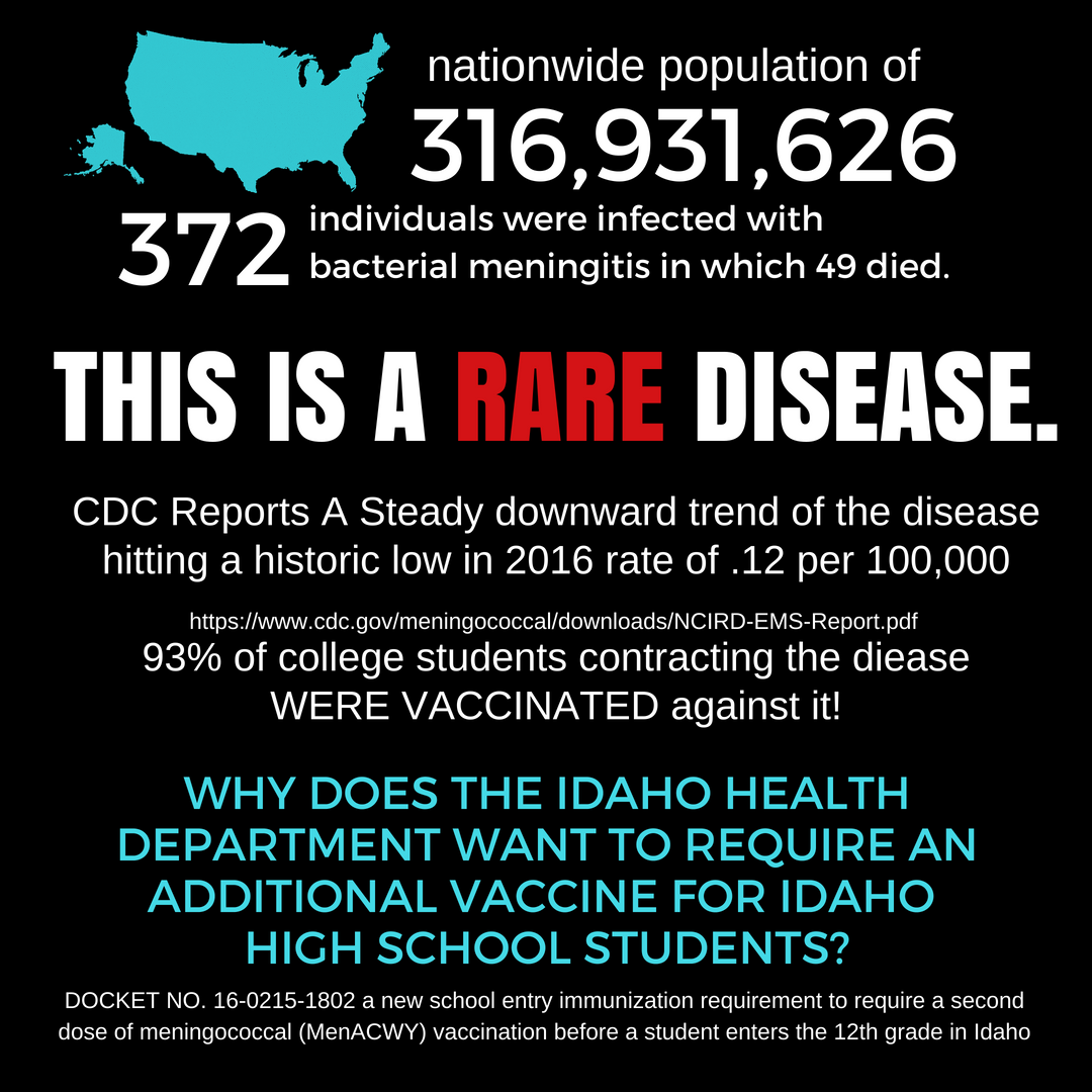 Menegitis cause by neisseria meningitidis is VERY RARE with a one in a million chance of getting the disease. CDC reports its at an all time low. 372 cases in 2016. Less than 3 people a year average get bacterial or viral meningitis in Idaho. Death from the disease is VERY VERY RARE. Idaho health department recently decided to add a booster shot of meningitis to the high school requirements. Here’s an article showing you how rare and ineffective the vaccine is.