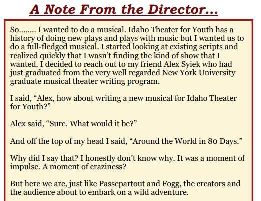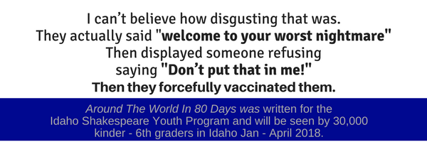 Heading to your child’s school is an updated classic 80 Days Around the World performed by the Idaho Shakespeare Festival. This musical, written specifically for the Youth Company Performances, takes you on a whirlwind tour of the globe and its people and includes five minutes of a very forced scene of vaccine propaganda. It is deeply upsetting that the director of this play, Tom Ford, would either submit to pressure to include this lengthy scene about vaccinations prior to travel in order to send a message, or think that this is, in any way appropriate to include when vaccinations are not a part of the book or movie the play is based on.
