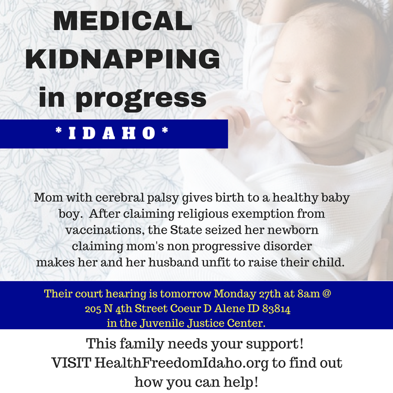 If you are able to, please come support this young family who have already been through so much. Prayers, well wishes, donations all very much appreciated. Please remember that because this is an ongoing case and a case that also involves a minor there is very little information that can be publicly released. All involved, any questions, media, news, etc. are being directed through their attorneys. Health Freedom Idaho will continue to report on public details as they become available. Thank you so much for your support for this family.