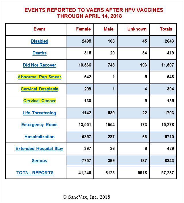 HPV is a devastating vaccine. The new reports from the United States VAERS database are in. The same report with active links to the search strings can be accessed via this link http://sanevax.org/vaers-report/ Even more disturbing a brand new paper just published by Gayle DeLong linking HPV vaccine to decreased fertility.