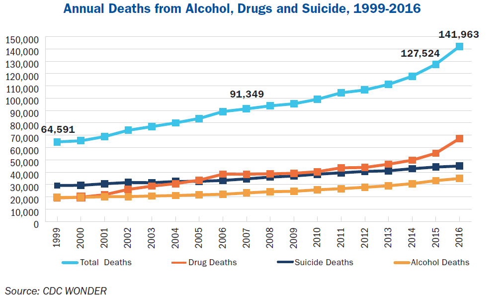 Our nation is facing a mounting crisis related to alcohol and drug misuse as well as a mental and behavioral health crisis that can be glimpsed in the rising suicide rate. In 2016, U.S. life expectancy decreased for the first time in two decades, and these three public health crises have been major contributing factors to this shift.