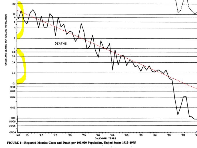 See that tiny blip right around 1967? That’s when vaccines “drastically” reduced measles deaths.