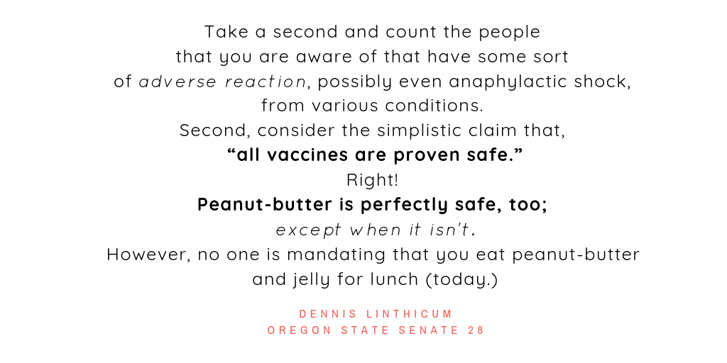An encouraging letter from a state Senator Dennis Linthicum regarding the proposed mandatory vaccine legislation introduced in Oregon.