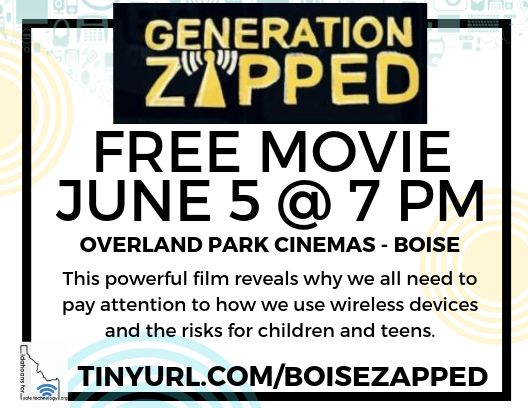 Free Movie Screening June 5 at 7 pm at Boise’s Overland Park Cinemas. We are pleased to partners with Idahoans for Safe Technology to bring this screening of GENERATION ZAPPED an eye-opening documentary which reveals that wireless technology can pose serious health risks, from infertility to cancer. Through interviews with experts in science and public health, along with people suffering from high sensitivity to wireless radiation, local experts will be on hand to share ways you can reduce your exposures and protect your family.