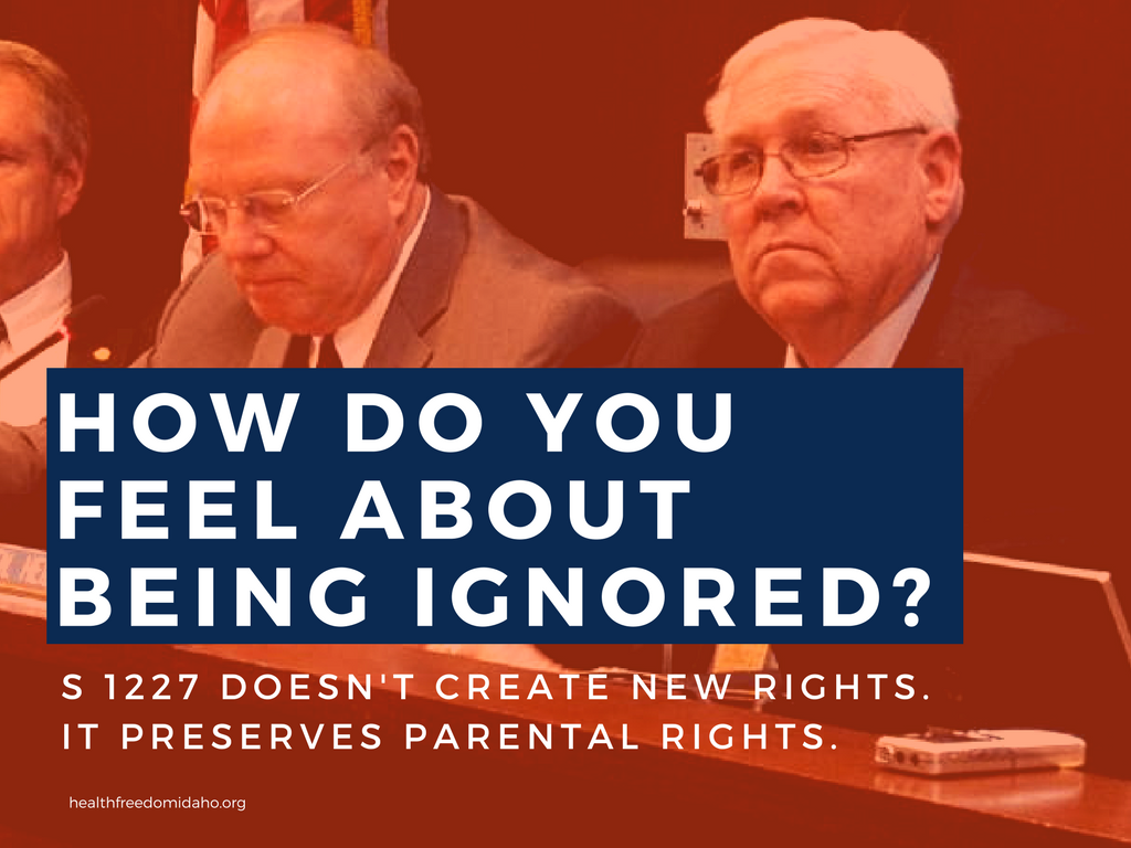 However, it quickly became apparent that Senator Heider, did not intend to ever let the bill leave his drawer. In fact, Senator Heider told Miste Karlfeldt, Executive Director of Health Freedom Idaho that he had instructions from Governor Otter, directing him to keep the bill drawered. The governor and Dick Armstrong, the director of the Department of Health & Welfare, had plans for a bill that would change the statute to specify that IDHW’s form be required from parents when attempting to register their children for school after exercising their right to exempt them from vaccinations. After members of Health Freedom Idaho and other concerned parents inundated the governor’s office with phone calls and emails protesting such actions, the controversial bill was never presented.