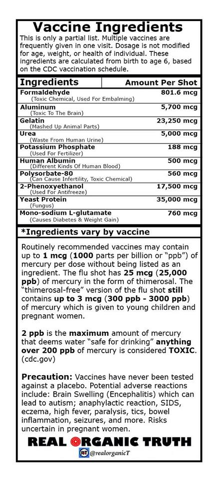 They want 300 million people to inject this stuff – mercury, gelatin, formaldehyde, salt solution, and octylphenol ethoxylate. There are no long term studies on safety. Why? You can’t test something long term that changes annually. The only effectiveness study is if a person creates antibodies. Antibodies does NOT equal protection