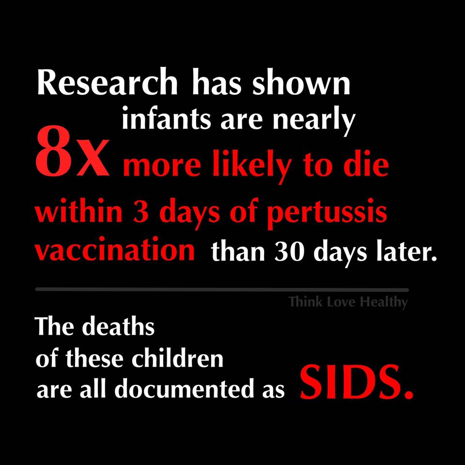 What we know: SIDS occurs most often at 2, 4, and 6 months of age… when several vaccines (typically 7-8 vaccines) are administered all at once, and research has shown that an infant is nearly 8x more likely to die within *three days* following vaccination with pertussis, compared to 30 days later.