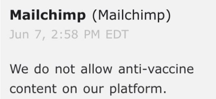 Mailchimp has said they are actively screening ALL accounts for anything that resembles liberty in your healthcare decisions! The company began quietly enforcing this decision last week shutting down access to groups such as Wyoming Health Freedom and Colorado Alliance for Vaccine Choice. https://mailchimp.com/announcements/vaccine-misinformation/