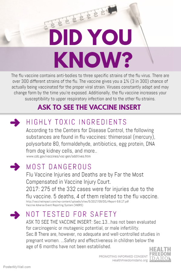 Here are some distrubing flu shot facts. Don’t take our word for it read the fine print. Visit your local drug store, grocery store or clinic and ask for your own copy of the  manufacturer’s insert for the flu shot and READ IT ALL FOR YOURSELF! Pay close attention to Section 11 for ingredients, Section 13 for studies regarding cancer or mutations. Section 8 for studies and risks to pregnant women and young children. Health Freedom STARTS with informed consent. Your choice to vaccinate should come from carefully weighing the risks verses the benefits. Marketing propaganda is designed to get you to ‘buy their product’ which makes vaccine manufacturers billions in profit without any risk of liability.