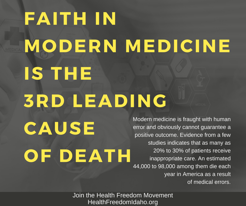 Medication and medical procedural errors are the third leading cause of death in the U.S. The death toll equivalent to more than if two fully loaded 747’s crashed every day. A May 2016 study by Johns Hopkins estimated that preventable harm in hospitals contributes to the deaths of between 210,000 and 440,000 patients each year. That would make medical injury the nation’s third-leading cause of death, just behind heart disease and cancer.1  The Idaho Child Fatality Review Team presents its annual report on child deaths occurring in Idaho annually.  Grossly missing are the statistics for deaths or critical injury of children due to medical error.  In Idaho, there is no billing code, no procedure or outcome code for medical errors. Due to the lack of tracking, hospitals and staff cannot identify common links or circumstances in order to prevent similar tragedies in the future.  For the last several years our Legislators have been pressured by out-of-state vaccine advocate Paul Offit through the local Wingate organization Let Children Live, to write laws that would force parents to use standard allopathic care or face criminal charges and the removal of their children from their family. <See Bill 1182 from 2017> Forcing families to seek government mandated medical treatment, that is statistically shown to be the third leading cause of death.